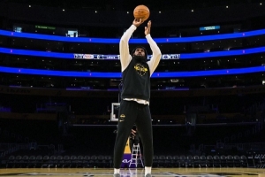 体育资讯11月26日讯 今日,湖人官推晒出一组前锋詹姆斯的赛前热身照。