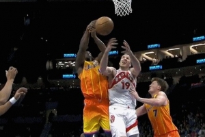 GIF-赛恩·詹姆斯与珀尔特尔争抢篮板出界,裁判吹猛龙球权;黄蜂挑战成功,拿回球权