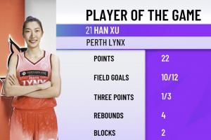 韩旭此役完成WNBL首秀,出战28分钟41秒,两分9中9,三分3中1,罚球2中1,砍下并列全队最高的22分,另外有4篮板2盖帽。