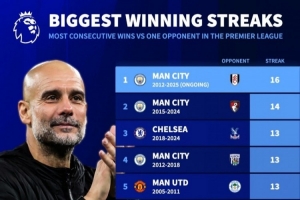 英超历史连胜同一对手榜:曼城占7席,16连胜富勒姆+12连胜阿森纳