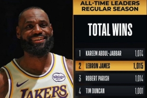詹姆斯收获了他生涯第1015场常规赛胜利,高居历史第二,而他距离历史纪录保持者贾巴尔(1074)还差60胜。