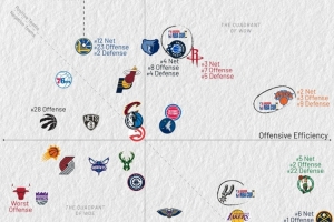 横轴代表进攻效率,越靠右越好,纵轴代表防守效率,越靠上越强。第一象限的球队多为发挥出色的球队,而在第三象限的球队通常为战绩比较糟糕的球队。