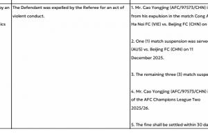 曹永竞被处以停赛4场,其中包含其于2025年11月27日河内公安对阵北京国安的比赛中被罚下所自动触发的1场停赛。