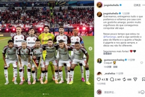 弗拉门戈中场若日尼奥社媒晒出首发球员的合照,配文:“我们奋力拼搏,倾尽全力,虽然带着些许遗憾踏上归途,但仍对迄今取得的成就感到无比自豪。”