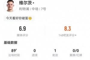 体育资讯12月21日讯 利物浦在本轮英超焦点战对阵热刺,维尔茨本场数据如下:
