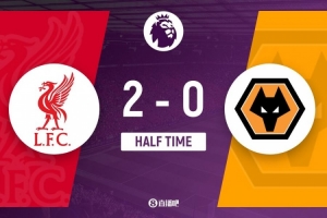 上半场补时3分钟,利物浦2-0狼队。