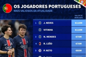 体育资讯12月28日讯 德国转会市场列出了葡萄牙球员身价排名,若昂·内维斯、维蒂尼亚1.1亿欧居首。