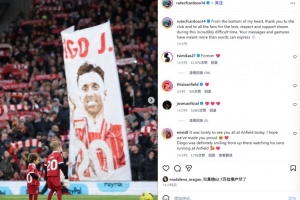 若塔的遗孀鲁特尔也在赛后通过社媒晒出现场照表示感谢:“我由衷感谢俱乐部和所有球迷在这段无比艰难的时期所展现出的爱、尊重和支持。你们的留言以及行动让我感动到难以用言语表达🤍”。