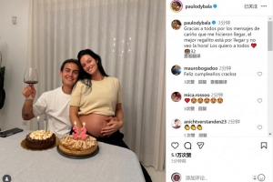 迪巴拉社媒晒出与怀孕妻子一起庆祝的合照,配文:“感谢大家的生日祝福,最棒的礼物即将到来,我已迫不及待!爱你们所有人。”