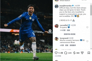恩佐社媒晒出庆祝进球的照片,并写道:“艰难的时期,但这支球队总能挺身而出,拼尽全力。感谢无论我们去往何处都来到现场支持的球迷们,你们太棒了。”