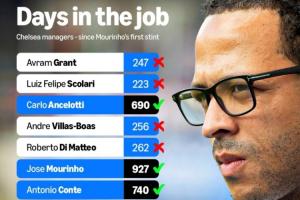 近13位切尔西正式主帅中,超过半数未能执教满1年,穆里尼奥是这期间在任时长最久的主帅。