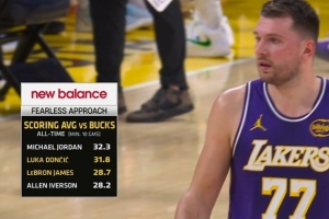 (对阵雄鹿场均得分榜,乔丹32.3分最高,东契奇31.8分第二,詹姆斯28.7分第三,艾弗森28.2分第四