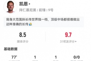 体育资讯1月12日讯 拜仁在本轮德甲7-1领先狼堡,凯恩本场数据如下: