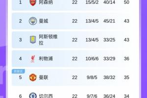 体育资讯1月19日讯 今日英超第22轮,维拉0-1不敌埃弗顿。英超前四——阿森纳、曼城、维拉、利物浦,均遭遇连续两轮不胜,本轮仅曼城、维拉输球。最新积分榜如下: