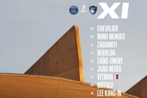巴黎首发:30-舍瓦利耶、25-努诺-门德斯、6-扎巴尔尼、4-贝拉尔多、33-扎伊尔·埃梅里、87-若昂·内维斯、17-维蒂尼亚、24-马尤卢、19-李刚仁、9-贡萨洛·拉莫斯、49-姆巴耶
