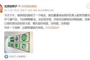 博主北京的晖子在社媒写道:“今天下午,很突然的接到了一个电话,周总邀请球迷组织负责人就受罚情况到工体开个通气会,18点刚刚散会。会议有涉密,内容无法跟各位详细说明,但是我可以很负责任的告诉大家,俱乐部没有错,没有错,没有错!