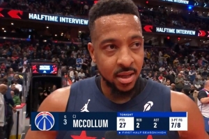 上半场,奇才后卫麦科勒姆手感滚烫,打了18分钟13投10中,三分8中7狂砍27分2篮板2助攻1抢断,正负值+22。