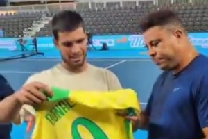 罗纳尔多与西班牙网球选手阿尔卡拉斯打网球,两人亲切交流,罗纳尔多还将自己的巴西队9号签名球衣赠送给阿尔卡拉斯。